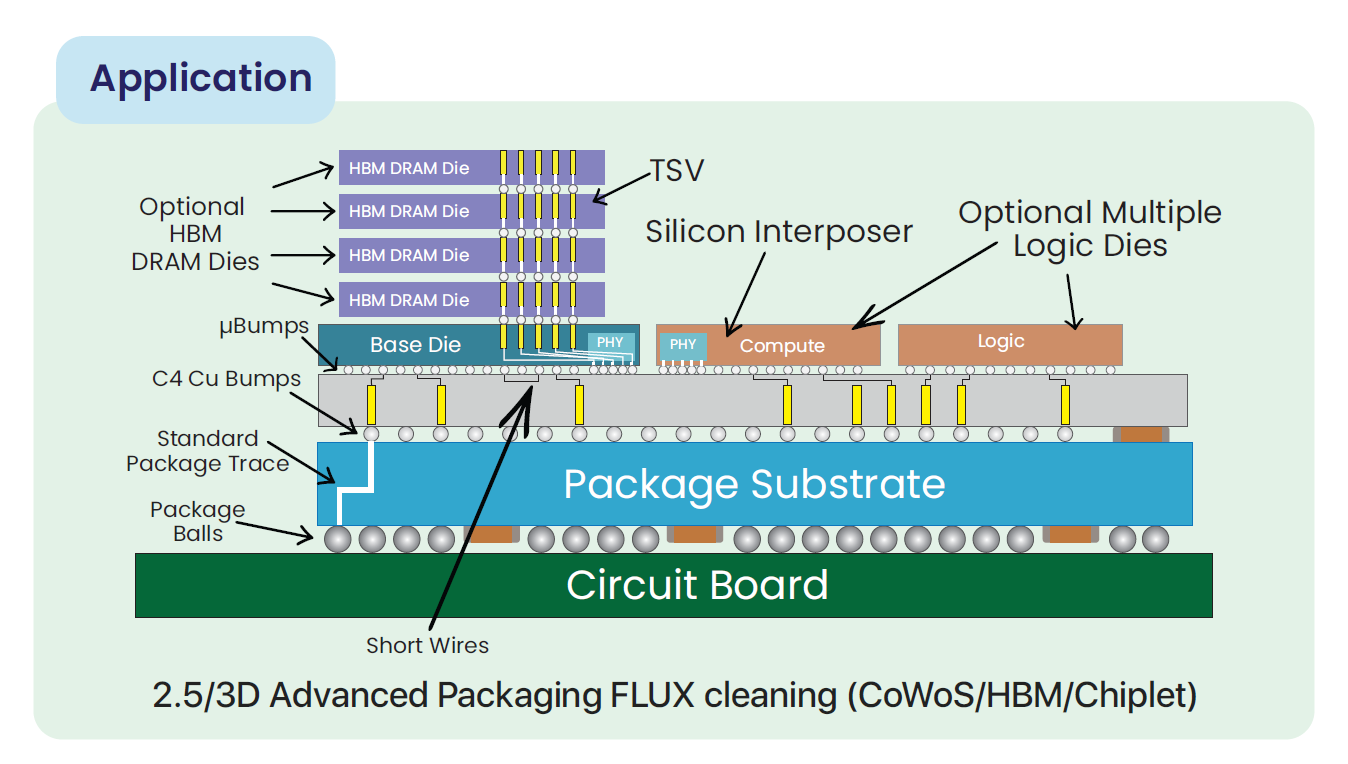 我们的清洗技术专为2.5D和3D封装以及大尺寸的 FCGBA(Flip Chip Grid Array)设计,旨在应对高密度、低间隙封装的清洗挑战。这类封装形式通常具有复杂的结构和极小的间隙,使得污染物和残留物更容易残留在难以触及的区域。针对这一难题,我们的清洗设备采用先进的喷嘴设计和清洗工艺,能够深入狭小的间隙和复杂的封装结构,有效去除微小颗粒、焊接残渣和其他污染物。通过精确的清洗过程,我们可以确保芯片封装在不受损伤的情况下达到最佳的洁净度,从而提高产品的性能和可靠性,满足高端半导体封装对清洗质量的严格要求。